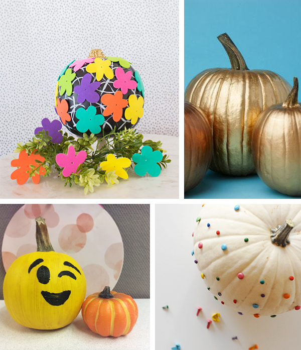 Here's a More Fun idea for keeping pumpkins a tradition, but putting a new spin on them: paint them instead! There's less clean up, no sharp objects involved, and it's an easy way for everyone to really personalize their pumpkin! Plus, they can be kept inside and won't get yucky so quickly. For extra-easy decorating, use spray paint.