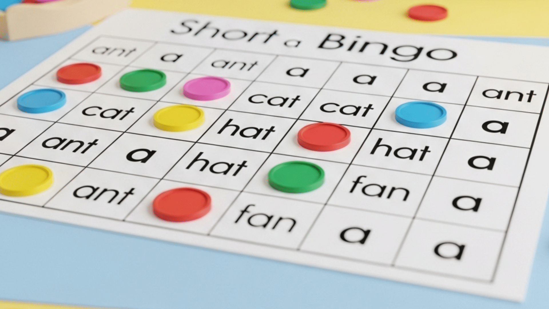 - Materials required: Bingo cards with short ‘a’ words, counters or chips.